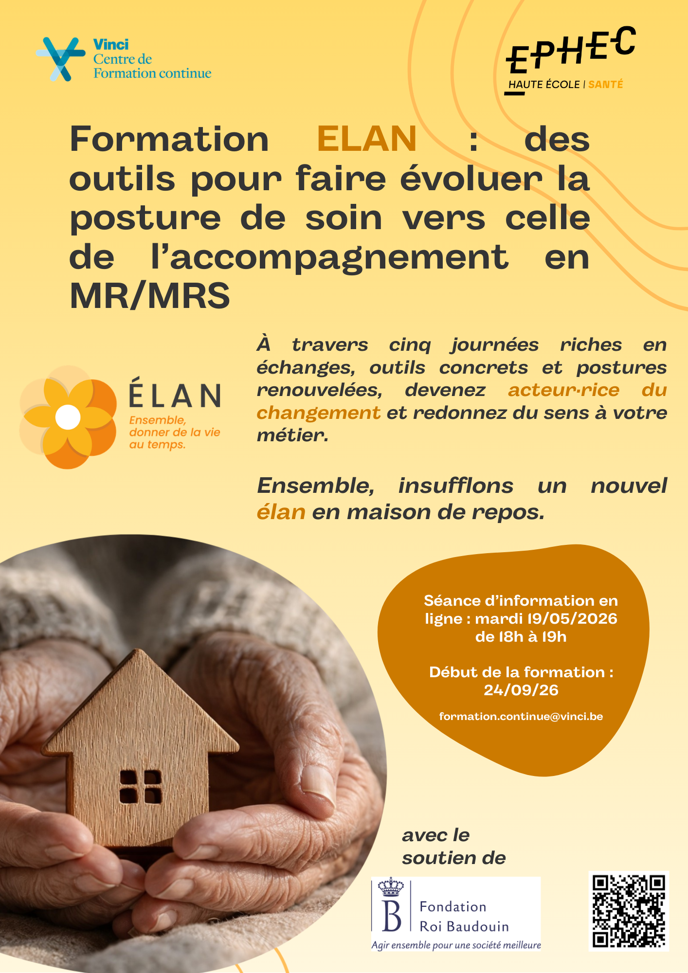 Lors de cette séance d’information en ligne du mardi 19/05/26, nous vous présenterons la formation ELAN, un programme dynamique et collaboratif qui vise à insuffler de nouvelles idées, partager des outils concrets et soutenir les équipes dans leur mission essentielle auprès des aînés.